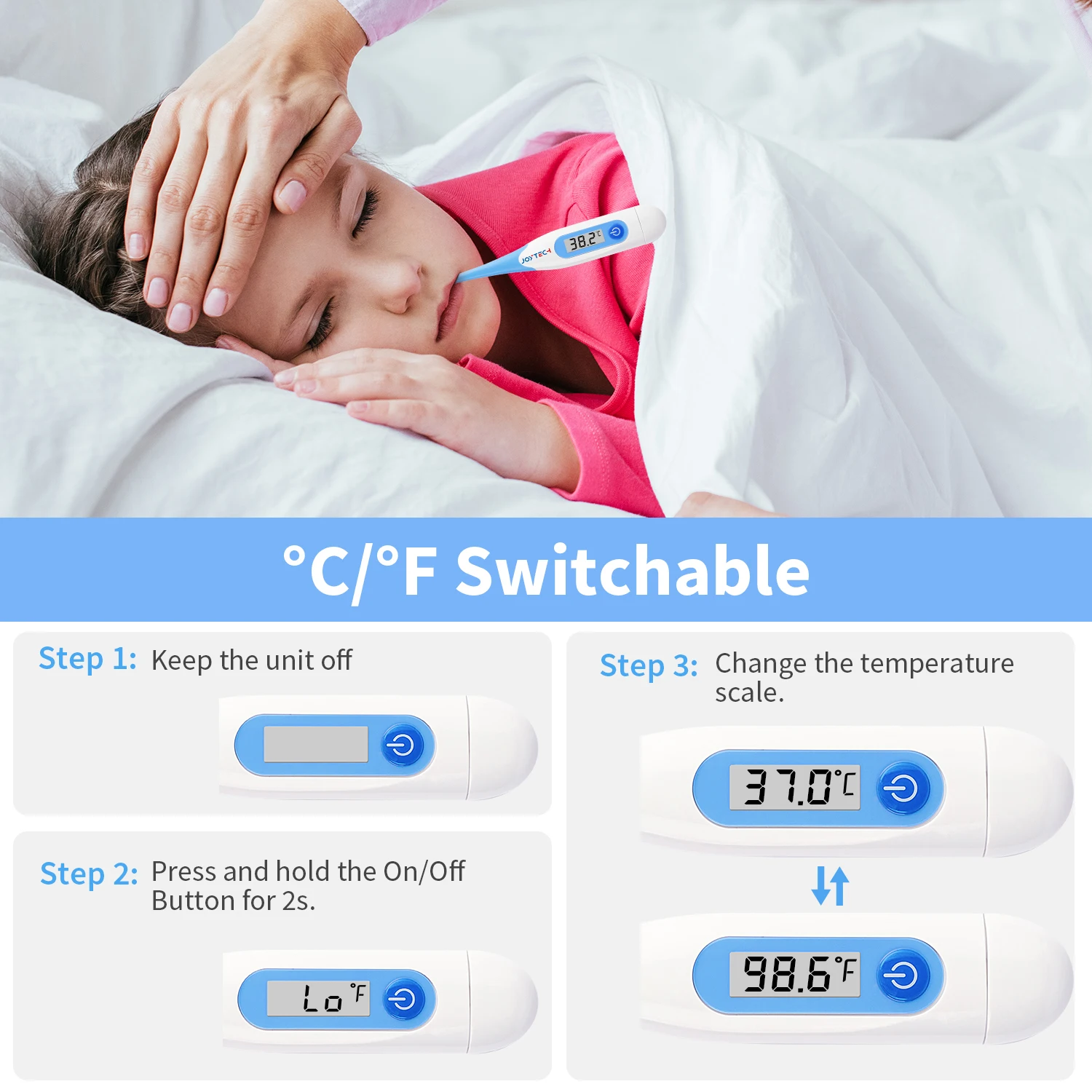 | 1, Jumbo LCD Display2, Flexible Tip 3, Waterproof 4, ℃ / ℉ Switchable 5, Fever Beeper |